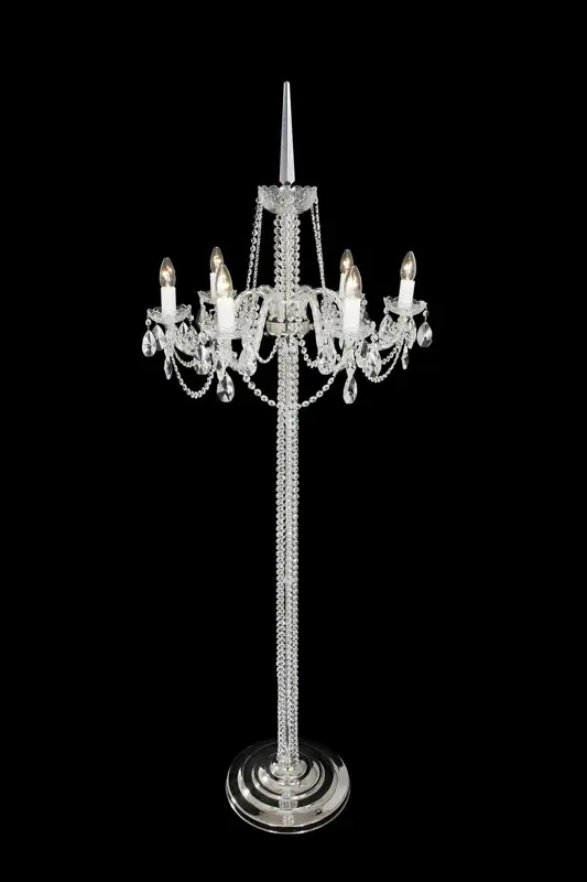 Wysoka lampa podłogowa jest w rzeczywistości kompletnym żyrandolem z sześcioma ramionami, zamocowanymi na wysokiej stopie. Metalowa rurka jest ukryta pod długimi łańcuchami błyszczących ciętych kryształów; wierzch lampy wykończony jest ciętym kryształowym kolcem. Oprawa jest miłym uzupełnieniem żyrandoli w tym samym projekcie. Można zamówić lampę w kolorze złotym lub srebrnym.