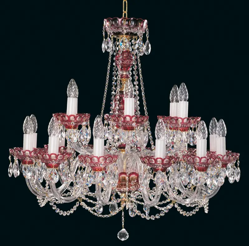 Kryształowy żyrandol z osiemnastoma ramionami na dwóch poziomach. Miski i centralne części wykonane są z wykorzystaniem technologii szkła nakładkowego, w którym do szklanej misy nakładana jest kolorowa warstwa szklana, a po schłodzeniu wzór jest wycięty. Świecznik ozdobiony jest kryształowymi zawieszkami w kształcie migdałów. Lampy tego typu są dostępne w kolorze niebieskim, czerwonym, zielonym, fioletowym lub czarnym.