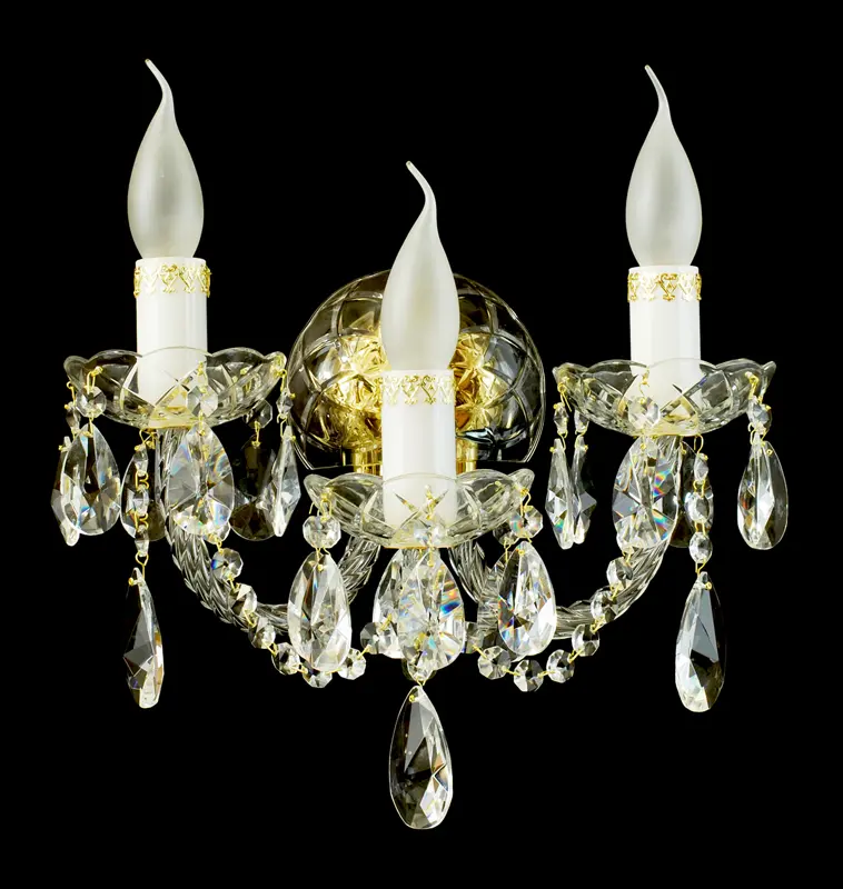 Kinkiet z czeskiego kryształu z trzema szklanymi ramionami ozdobiony jest kryształowymi zawieszkami w kształcie małych kryształków i dużych migdałów. Ciekawym elementem ozdobnym jest filigranowy ornament na pokrowcach rękawów. Oferujemy wersję złotą i srebrną.
