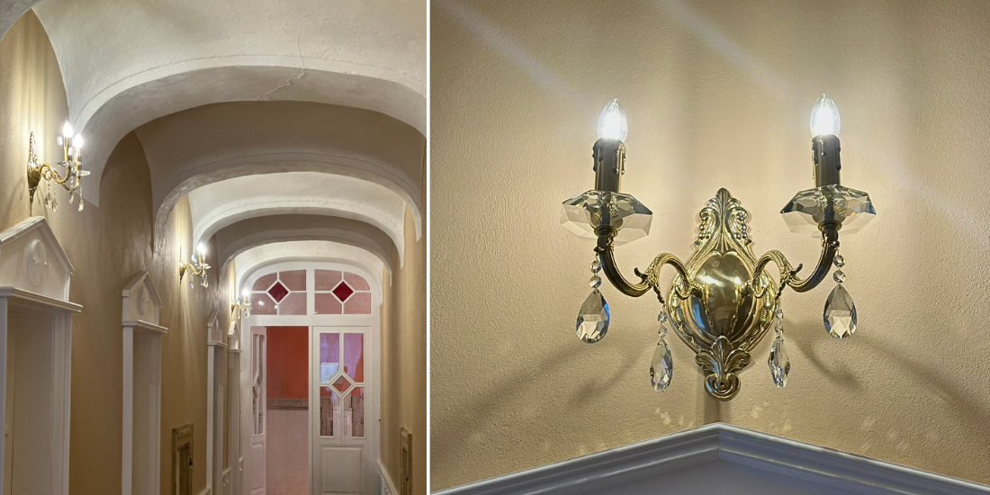 Korytarze zamku oświetla 18 pięknie wykonanych mosiężnych kinkietów. Oprawy te zachwycają eleganckimi kształtami i błyszczącymi kryształowymi misami. Tworzą one świetlny wzór na ścianach, który podkreśla oryginalne sklepienia, nadając przestrzeni historyczny charakter z nowoczesnym akcentem.
