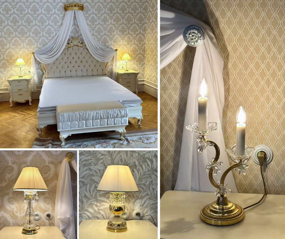 Wyjątkowość i luksus podkreśla trzecia lampa stołowa, której centralne elementy ozdobione są ręcznie malowanym 24-karatowym złotem. Ta lampa z kloszem z tkaniny została stworzona z myślą o historycznych wnętrzach i doskonale komponuje się z innymi lampami w tym samym stylu.