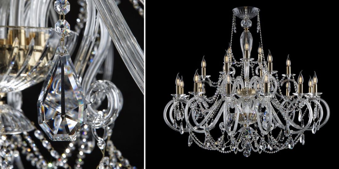 Kryształowe żyrandole, każdy o średnicy 120 cm, od razu przyciągają wzrok swoim oryginalnym i kompaktowym designem. 21 żarówek, rozmieszczonych na trzech poziomach, umieszczonych jest na szklanych ramionach. Pięknie wycięte kryształowe misy nadają żyrandolowi wyjątkowy wygląd.