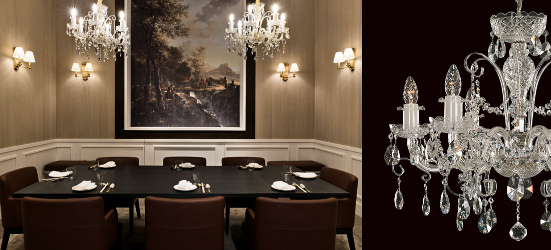 Klejnotem tej przestrzeni są dwa wspaniałe kryształowe żyrandole, które świecą w prywatnym salonie. Żyrandole wykonane są z czeskiego kryształu. Są bogato zdobione ręcznie wykonanymi detalami i kryształowymi zdobieniami. Są one wynikiem sztuki wykwalifikowanych czeskich szklarzy.