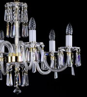 Żyrandol sufitowy należy do kolekcji nowoczesnego oświetlenia, ale nadal jest to tradycyjny czeski kryształ wysokiej jakości. Główne znaki tej grupy żyrandole są oryginalność, prosty deseń i wysokie walory estetyczne. Prosty, ale imponujący żyrandol z sześcioma szklanymi ramionami zdobią kryształowe elementy szklane - cięcie miski i zawieszki w kształcie długich kropli. Można wybrać złoty lub srebrny wariant.