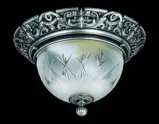 Lampa sufitowa posiada ramę z mosiądzu ze stylizowanym motywem kwiatowym i ręcznie krojony abażur zrobiony z matowego szkła. Elementy metalowe są ozdobione czarną patyną. pasuje szczególnie dla mniejszych wnętrz z niższym sufitom, urządzonych w stylu rustykalnym lub historycznym.