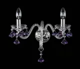 Kryształowy kinkiet z dwoma szklanymi ramionami ozdobiony jest kolorowymi ozdobami w kształcie małych piramid. Metalowe rurki pod żarówkami zwiększają połysk lampy. Oprawa dobrze uzupełnia żyrandole w tym samym deseńe.