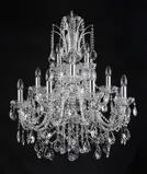 Duży, bogato zdobiony kryształowy żyrandol posiada 16 żarówek na trzech poziomach, umieszczonych w pięknie wyprofilowanych szlifowanych miskach. Żyrandol zdobią szlifowane czeskie kryształy – długie łańcuchy małych ośmiokątów i duże migdałowe zawieszki. Dzięki perfekcyjnemu szlifowi i specjalnej kompozycji szkła, światło sztuczne i dzienne załamuje się na wszystkie odcienie, tworząc wspaniałą atmosferę we wnętrzu. Lampa w złotym lub srebrnym wykończeniu idealnie sprawdzi się w przestronnych pomieszczeniach z wysokimi sufitami, gdzie jej luksusowy wygląd w pełni się wyróżni. Czytaj więcej